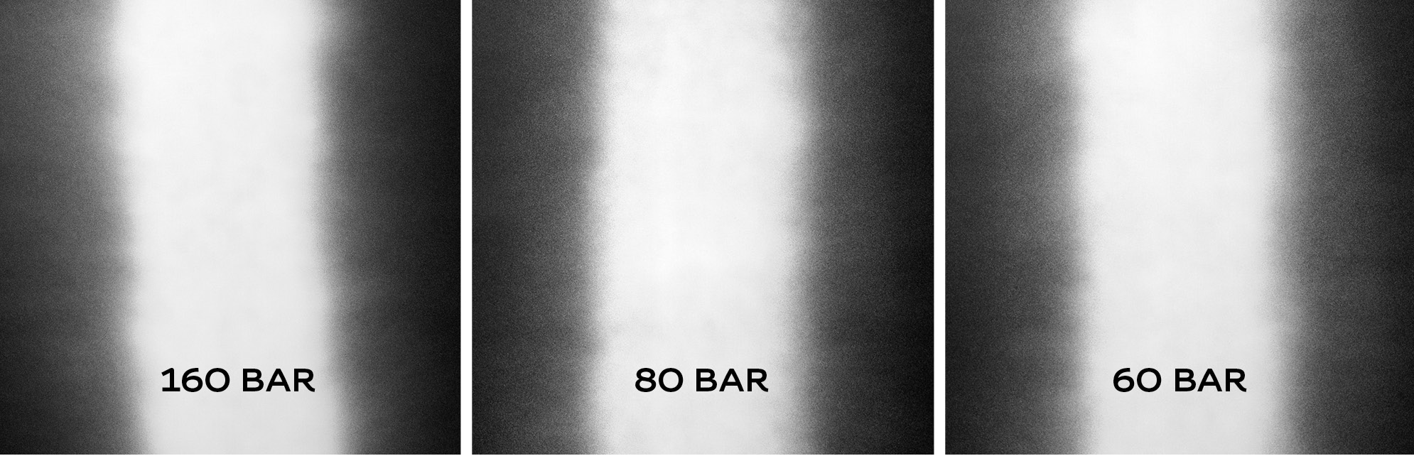 Hier bitte einmal genau hinschauen. Kein Unterschied zu erkennen? So soll es sein! Ob 160 bar, 80 bar oder 60 bar – alle Oberflächen sind gleich, die Sprühränder sehr fein zerstäubt. Links das bekannte, bei 160 bar entstehende Spritzbild eines herkömmlichen Airless-Lacks. In der Mitte der bei 80 bar versprühte Rubbol BL Easy Spray und rechts Rubbol BL Rezisto Spray, der mit 60 bar auf die Fläche aufgebracht wurde – ohne temperieren des Materials.